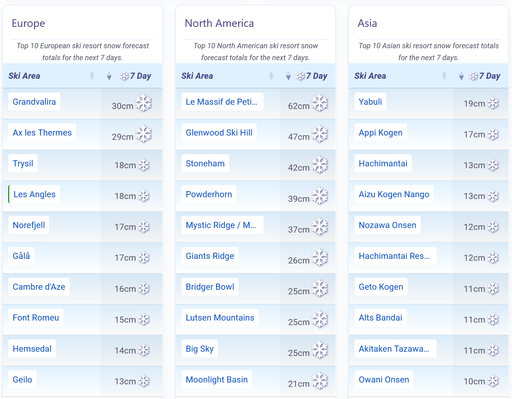 Snow forecast for the Alps, America and Japan.