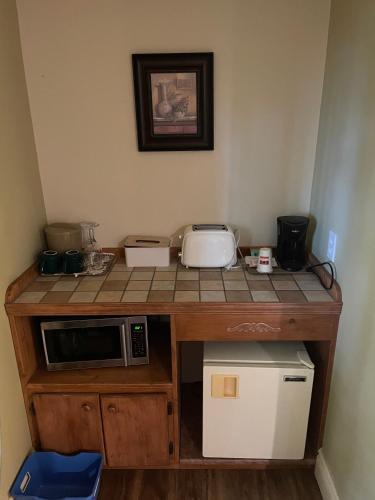 A 2-level room at Motel au P'tit Sapin includes a dining area with microwave and fridge. A sofa bed is provided for additional sleeping space.