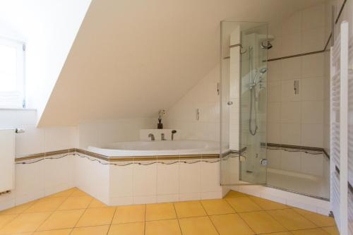 Luxury apartment on the top floor (5th floor) of the hotel. This apartment is without balcony. The hotel elevator only goes up to the 4th floor, our guests have to go up the stairs to the last floor. There are 2 bedrooms. On request, an extra sofa bed can be arranged. The bathroom features a shower and a bathtub.
