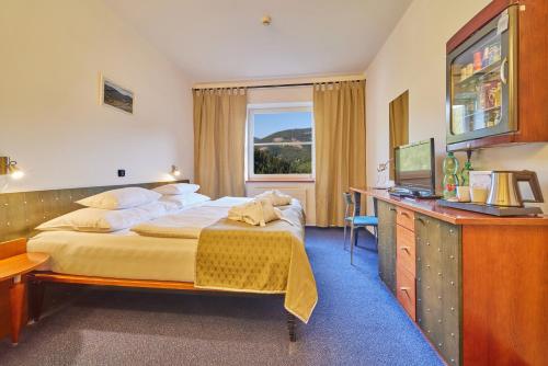 Hotel Horizont is located in the centre of Pec pod Sněžkou mountain resort, at the foot of Sněžka, the highest mountain of the Giant Mountains. Access to the swimming pool, hot tub, sauna, and fitness centre is free, as well as WiFi access and a free ski bus. Secured parking is possible for a surcharge. Children can enjoy an inside play area and an outside playground. During winter and summer season, animation programmes for kids are organised.