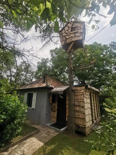 The holiday home has an outdoor fireplace and a picnic area.