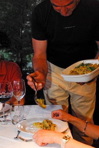 Guests can request both sweet and savoury items for breakfast, together with cappuccino or herbal tea. The restaurant is open on the weekend for lunch and dinner, and serves local specialities such as white truffles.
