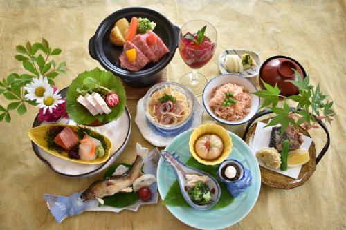 The quadruple room includes a shared bathroom fitted with a bidet, a hairdryer and slippers. The air-conditioned quadruple room features a flat-screen TV, tatami, a wardrobe, a safe deposit box as well as mountain views. The unit has 4 futons.